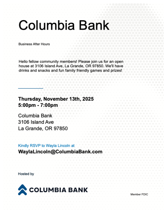 Hello fellow community members! Please join us for an open house at 3106 Island Ave, La Grande, OR 97850. We'll have drinks and snacks and fun family friendly games and prizes!