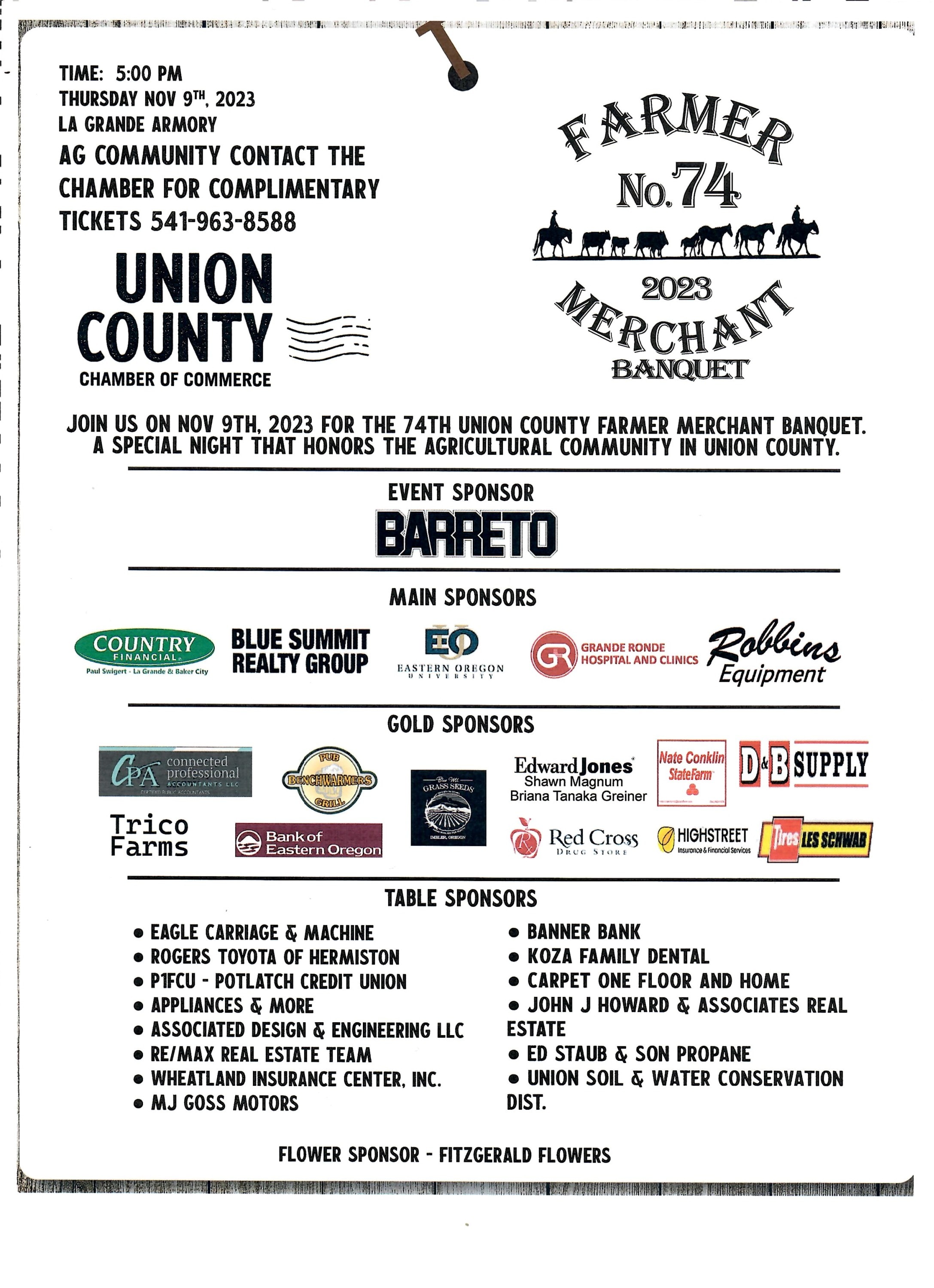 Ag Community please contact the Chamber of Commerce for your Complimentary tickets 541-963-8588 or membership@visitunioncounty.org