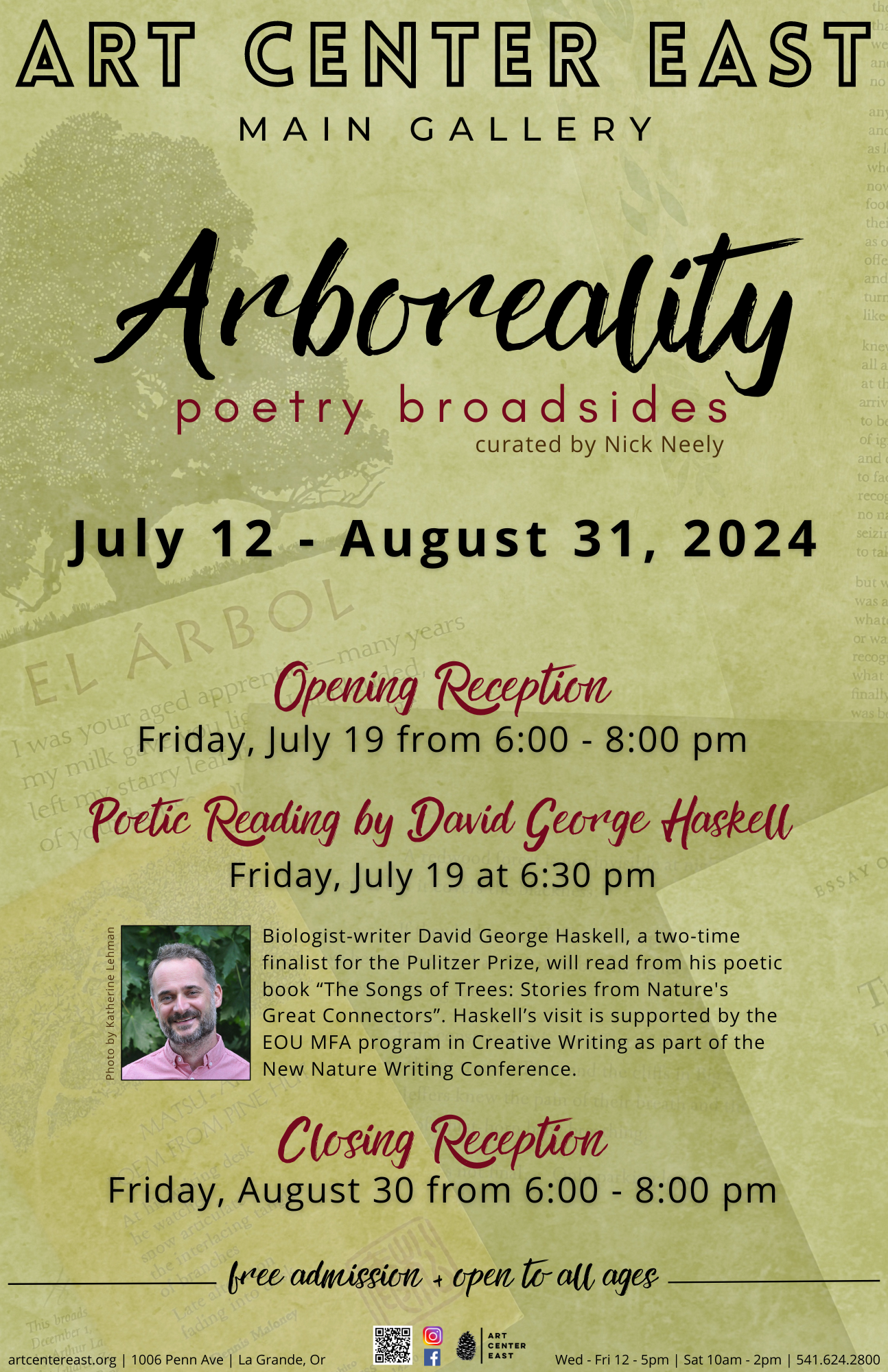 "My Heart" by Brenna Kimbro and "Arboreality, poetry broadsides" curated by Nick Neely will be on display starting July 12th with the opening reception through August 31st, and the closing reception on Friday August 30th.