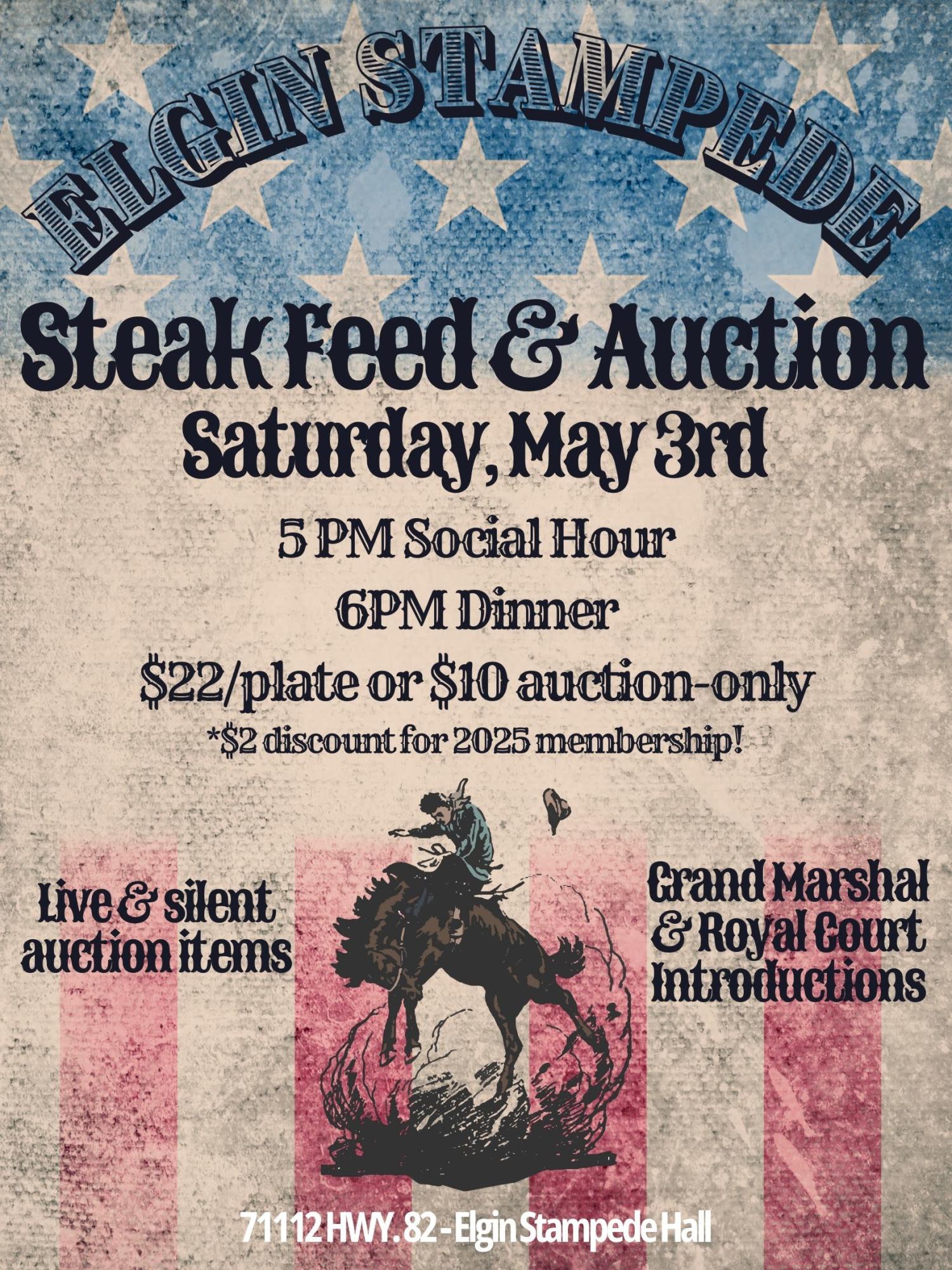Click here or go to https://www.elginstampede.com/events/stampede-steak-feed--auction for more information