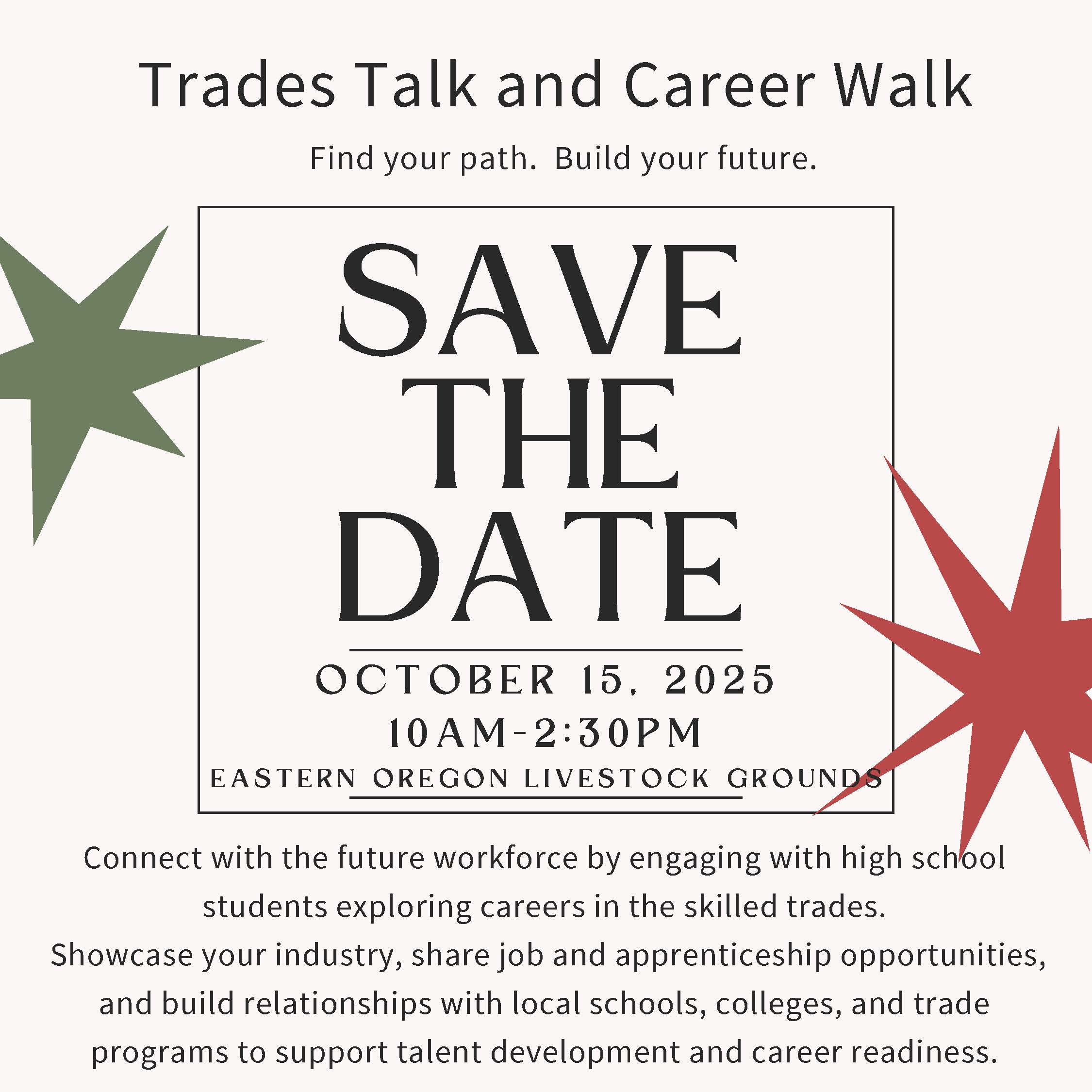 Connect with the future workforce by engaging with high school students exploring careers in the skilled trades. Showcase your industry, share job and apprenticeship opportunities, and build relationships with local schools, colleges, and trade programs to support talent development and career readiness.