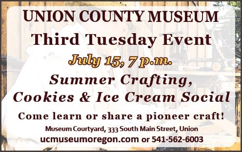 oin museum patrons, volunteers and board members at the Union County Museum Tuesday, July 15th, for their Third Tuesday event and enjoy these summer favorites. Admission is free to the Summer Crafts, Cookies & Ice Cream Social and the public is welcome! Activities take place in the Union County Museum courtyard, beginning at 7 p.m. and will go until dark.